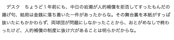 その舞台裏を本紙がすっぱ抜いたにもかかわらず、両球団が問題にしなかったことから、おとがめなしで終わったけど、人的補償の制度に抜け穴があることは明らかだからな。