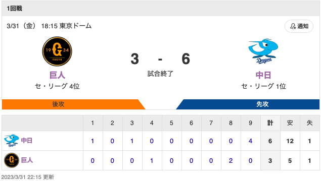 div class="t_h">931: 風吹けば名無し 2023/03/31(金) 21:49:57.51 ID:ytKqivp50#開幕戦