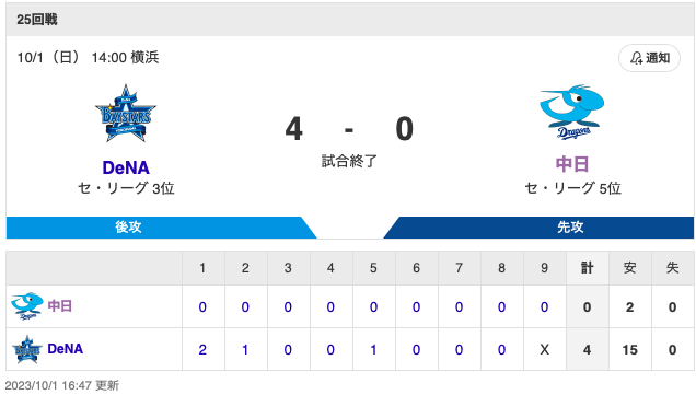 【試合結果】中日 0-4 DeNA 岡林163安打 橋本・斎藤無失点 2023年10月01日 カテゴリ:中日ドラゴンズ mixiチェック 839: 風吹けば名無し 23/10/01(日) 16:47:43 ID:Cv.i8.L10来週は勝つ! 【【試合結果】中日 0-4 DeNA 岡林163安打 橋本・斎藤無失点】の続きを読む タグ :#ドラゴンズ#試合結果