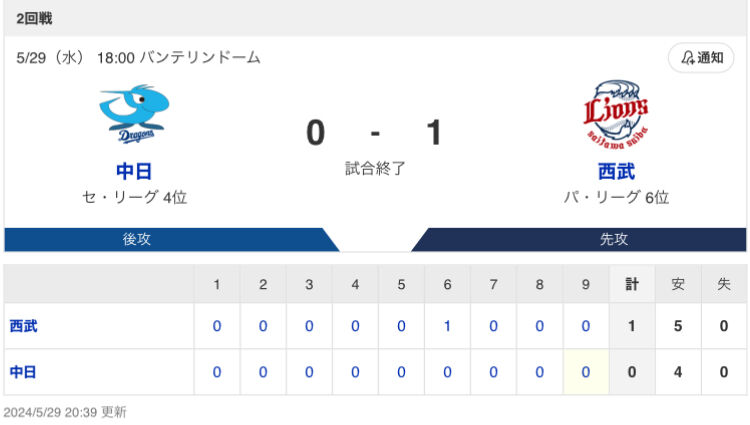 【試合結果】中日 0-1 西武 小笠原8回1失点 岡林マルチ安打