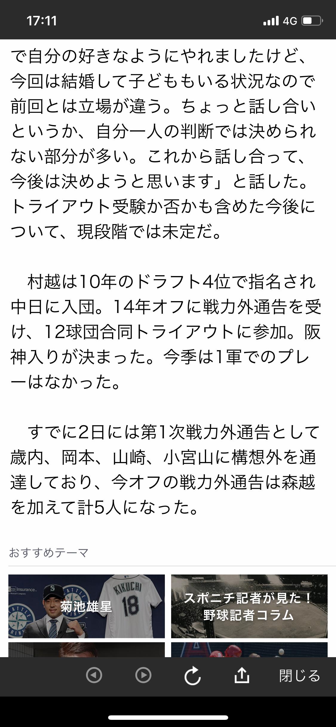 すでに2日には第1次戦力外通告として歳内、岡本、山崎、小宮山に構想外を通達しており、今オフの戦力外通告は森越を加えて計5人になった。