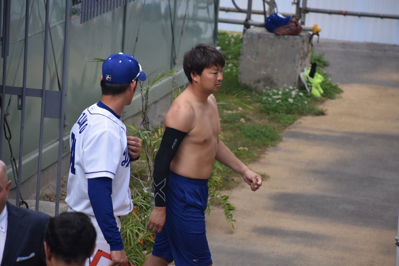 見よ、田島慎二投手のこの引き締まったナイスバディを😃!そして、よく見るとちょっとでべそ😙 pic.twitter.com/fP5GHbSGqA