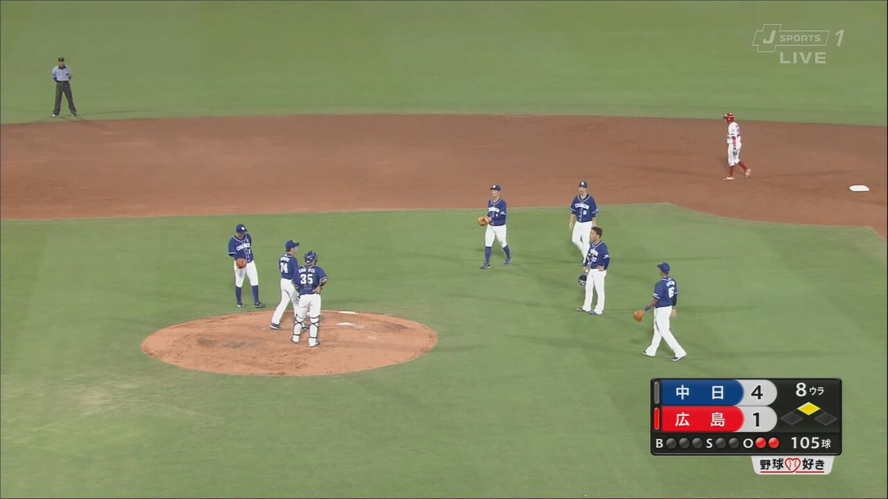 阿波野投手コーチがマウンドに駆け寄ったが、柳はまだ降板したくないとばかりに二塁手の守備位置付近まで後ずざり。