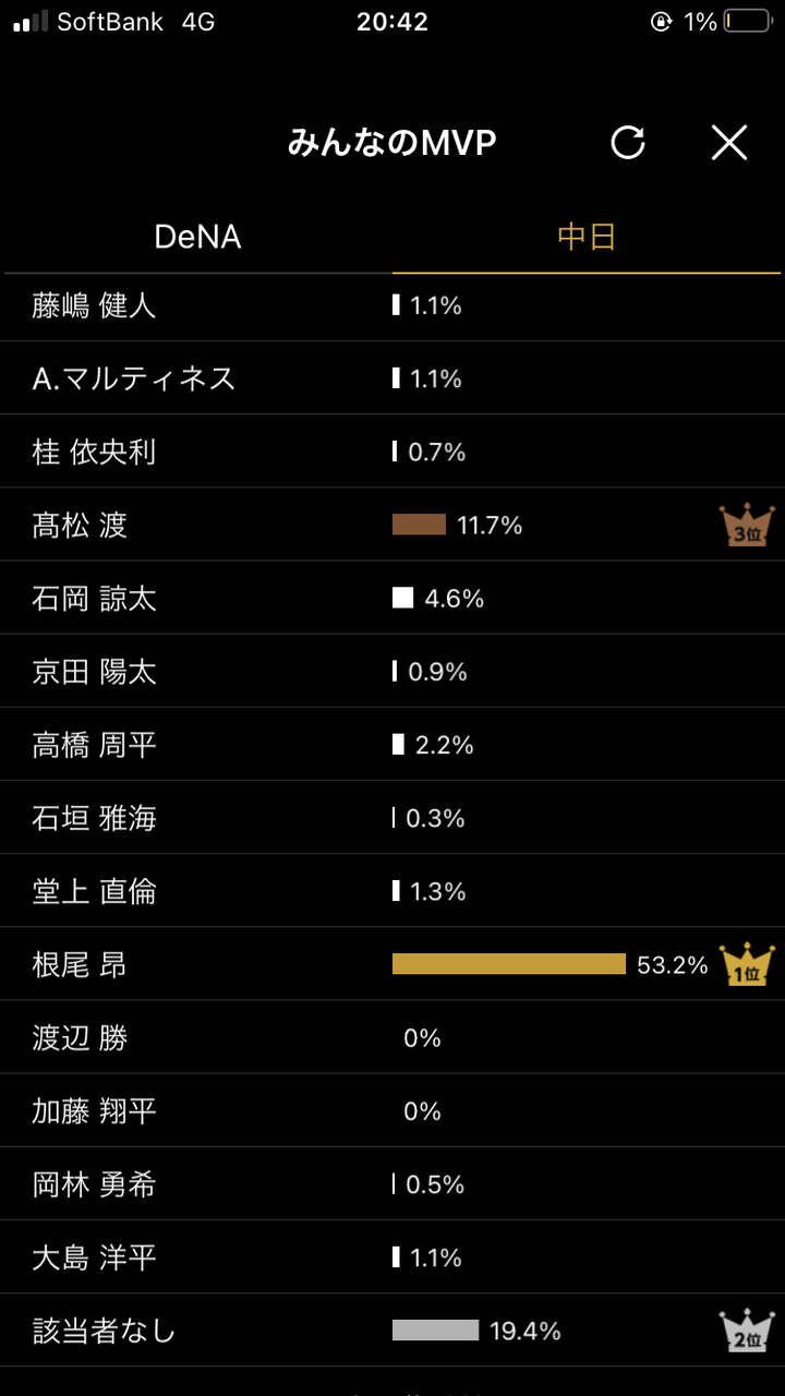 2回無失点の藤嶋と猛打賞のアリエルと無安打の大島が同率とかいうGG賞並のガバ投票