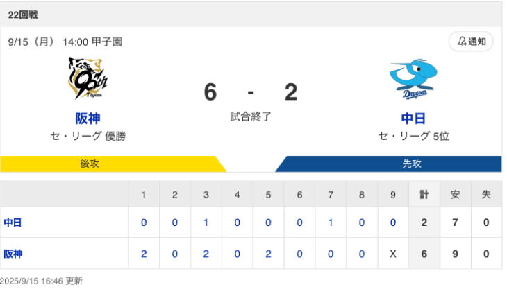 9/15 阪神@甲子園 4回 4失点●