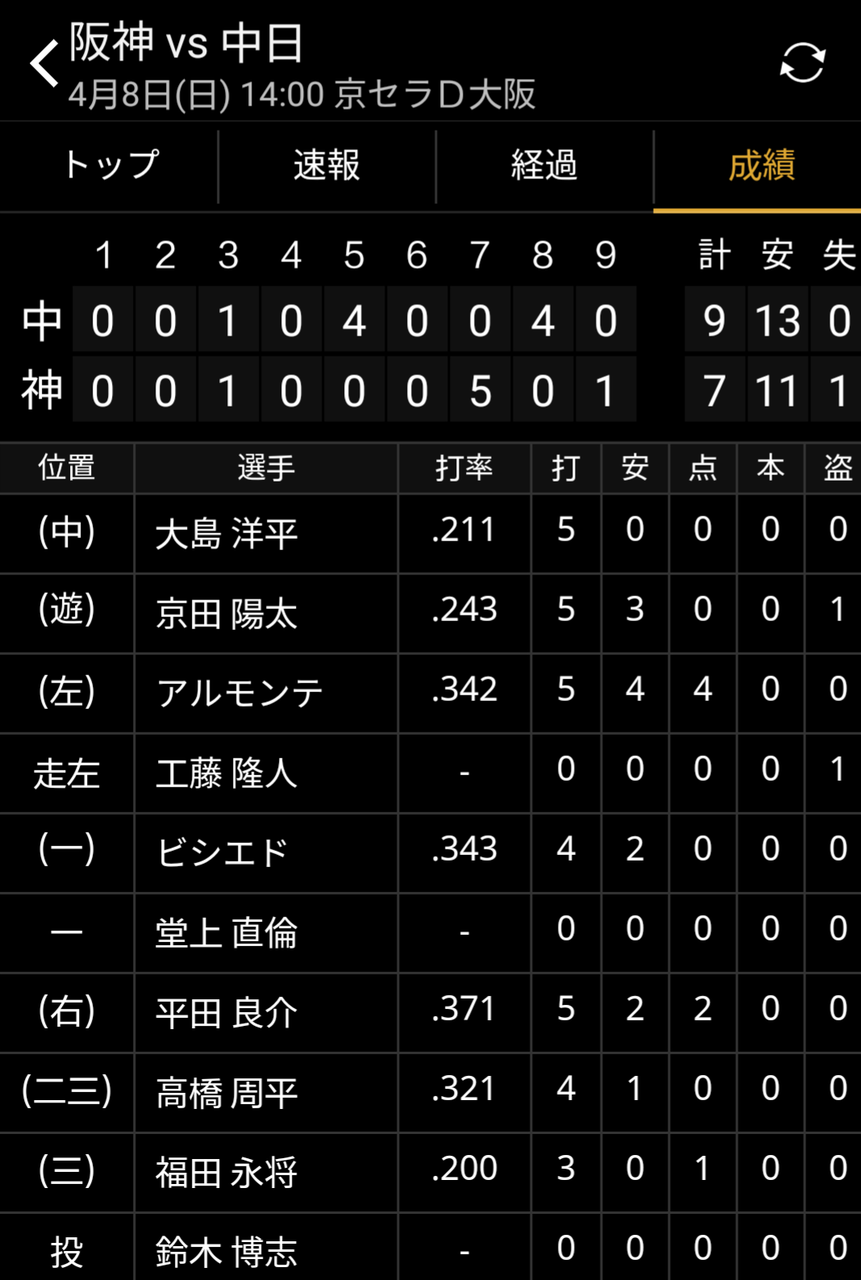 平田の圏打率は12打数5安打で.417やけどタイムリーヒットは今日が初という事実