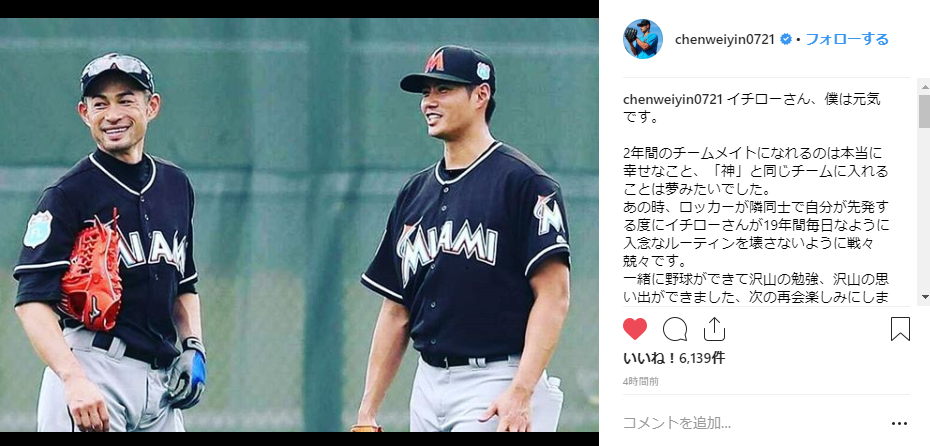 マーリンズのチェン「イチローさん、ぼくは元気です」“神”に返答 2019年03月23日 カテゴリ:中日ドラゴンズ mixiチェック 1: 風吹けば名無し 2019/03/22(金) 15:45:14.68 ID:Q7d+hOcy0 米大リーグ・マーリンズの陳偉殷投手(33)が21日(日本時間22日)、インスタグラムを更新。 21日に日本で現役引退を表明したマリナーズ・イチロー外野手(45)とのツーショット写真をアップし、「イチローさん、ぼくは元気です」と日本語で書き込んだ。 中日でも活躍した陳は16、17年シーズンをマーリンズでイチローと同僚として過ごした。21日深夜に都内で行われたイチローの引退会見で台湾メディアから 「台湾のファンにもメッセージを」と求められたイチローが「チェンは元気にやっていますか?」と、逆に問いかける場面があった。 陳はインスタグラムにマーリンズ時代の2人のショットを投稿。「イチローさん、ぼくは元気です」と“返答”した。 そして「2年間のチームメイトになれるのは本当に幸せなこと、『神』と同じチームに入れることは夢みたいでした。 あの時、ロッカーが隣同士で自分が先発する度にイチローさんが19年間毎日なように入念なルーティンを壊さないように戦々兢々です。 一緒に野球ができて沢山の勉強、沢山の思い出ができました、次の再会楽しみにします」(原文まま)とかけがえのない2年間を振り返った。 【マーリンズのチェン「イチローさん、ぼくは元気です」“神”に返答 】の続きを読む タグ :#ドラゴンズ#OB#助っ人外国人#チェン・ウェイン#イチロー#メジャーリーグ