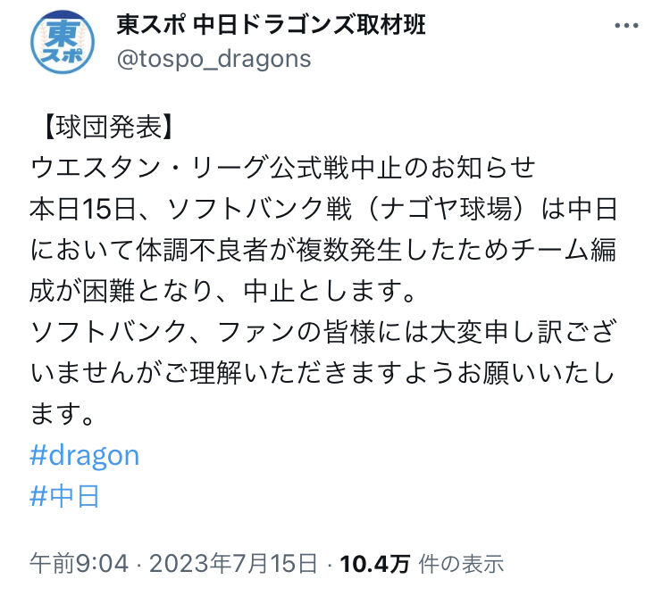 https://twitter.com/tospo_dragons/status/1680005381228216320【球団発表】