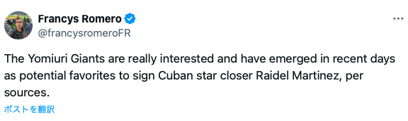 ライデル・マルティネス、巨人と2年総額24億円で合意と米報道 母国メディアは鼻高々「日本の盟主である球団で、ラテン系投手の象徴になる#ライデル・マルティネス #巨人
