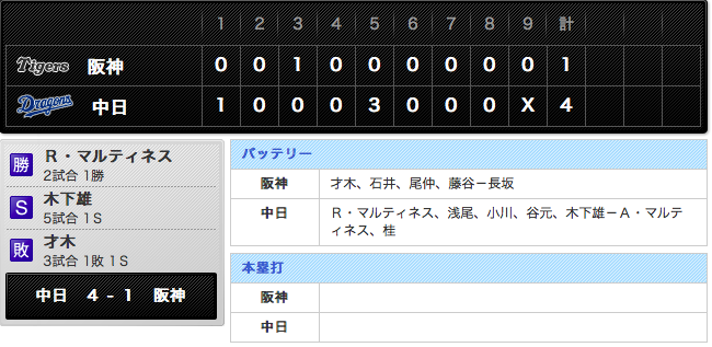 【ファーム試合結果】中日 4-1 阪神 R.マルティネスが6回6奪三振1失点 モヤ・石垣・渡辺が連続タイムリー 2018年04月07日 カテゴリ:中日ドラゴンズ mixiチェック http://dragons.jp/farm/scoreboard/10: 風吹けば名無し 2018/04/06(金)17:46:09 ID:AON 2軍の結果貼るの遅れてもうたここまで遅れると需要あるかわからんけど貼っとくですまんなウエスタンリーグ 中日vs阪神阪 001 000 000 | 1 6 0中 100 030 00X | 4 11 1勝 R.マルティネス 敗 才木 S 木下雄継投阪 才木,尾仲-長坂中 R.マルティネス,浅尾,谷元,木下雄-A.マルティネス,桂走塁死阪:江越(3回2塁)中:友永(8回本塁)失策中:石垣(4回)暴投阪:才木(1回2進),尾仲(7回3進) 【【ファーム試合結果】中日 4-1 阪神 R.マルティネスが6回6奪三振1失点 モヤ・石垣・渡辺が連続タイムリー】の続きを読む タグ :#ドラゴンズ#育成選手#二軍情報#試合結果#ライデル・マルティネス