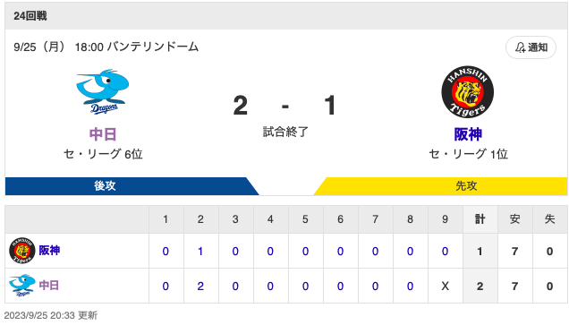 【試合結果】中日 2-1 阪神 2018ドラフトコンビの力で大きな1勝!勝野がプロ初セーブ&8回1失点の梅津が1177日ぶり白星!!!!! 2023年09月25日 カテゴリ:中日ドラゴンズ mixiチェック 862: 風吹けば名無し 23/09/25(月) 20:32:25 ID:xI.sv.L24カッタガネー 【【試合結果】中日 2-1 阪神 2018ドラフトコンビの力で大きな1勝!勝野がプロ初セーブ&8回1失点の梅津が1177日ぶり白星!!!!!】の続きを読む タグ :#ドラゴンズ#試合結果#記録#クローザー#勝野昌慶#梅津晃大#怪我人情報