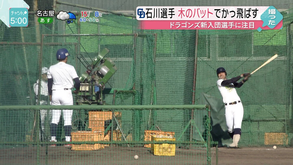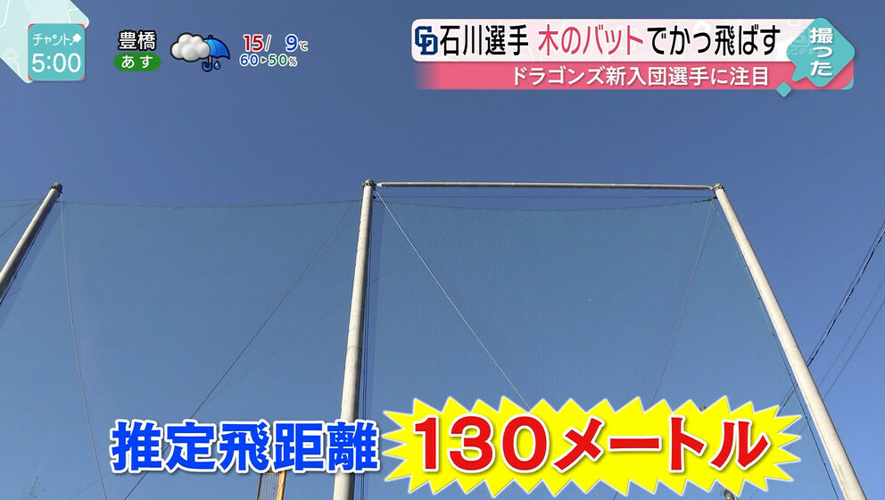 中日・石川昂弥、鈴木誠也モデル新バットで120m級打球連発 2019年12月09日 カテゴリ:中日ドラゴンズ mixiチェック 1: 風吹けば名無し 2019/12/09(月) 00:42:22.48 ID:K3AVgLLy0 中日のドラフト1位・石川昂弥内野手(18)=東邦高=が8日、来季の相棒を決めた。アシックス社から広島・鈴木誠也モデルを改良したバットが手元に届き、早速、フリー打撃。 推定飛距離120メートル級の打球を連発する上々の試運転に「このバットでやっていきます」と、満足げな表情を浮かべた。 全てカーブのマシン打撃。やや泳ぎ気味の体勢から左手一本でうまく拾った打球は、会心の当たりではない。にもかかわらず、余裕でフェンスを越えていった。 「2、3球、片手で打って柵を越えた。今までと違うな、と思いました」。石川も思わず目を見開いた。それほどニューバットは初打ちからフィットした。 180スイング余りで34本の柵越え。しかも13本は中堅115メートル、両翼95メートルのフェンスをオーバーしたどころか、左翼にある高さ15メートル超の防護ネットも越え、クラブハウスやテントにぶち当たった。 推定飛距離は120メートル。見詰めた東邦高関係者からは「すごい」、「(建物が)壊れそう」とため息が漏れた。 「めちゃくちゃ振りやすい。重さが910グラムくらいあるけど、振ったとき重く感じない。バットが良いと思います」 【中日・石川昂弥、鈴木誠也モデル新バットで120m級打球連発】の続きを読む タグ :#ドラゴンズ#石川昂弥#新兵器#打撃練習