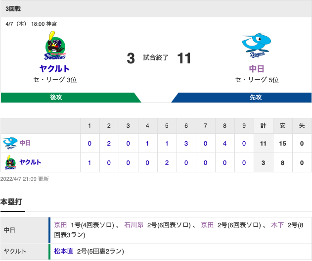 【試合結果】中日 11-3 ヤクルト 快勝で2カード連続勝ち越し&5割復帰!打っては4HR11得点&投げては高橋宏斗がプロ初安打初打点初QS初勝利!!!