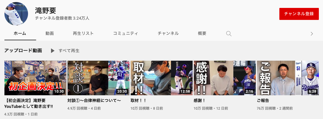 元中日ドラゴンズ滝野要さん、Youtube登録者数3万人を突破しレジェンドOBに割り入る 2022年10月19日 カテゴリ:中日ドラゴンズ mixiチェック 1: 風吹けば名無し 2022/10/18(火) 09:20:37.46 ID:ztSOR1990 YouTube登録者数 川上憲伸→23万人 井端弘和→17万人 谷繁元信→14万人 吉見一起→6.1万人 小田幸平→5万人 滝野 要→3.2万人←2週間前にスタートでココ https://www.youtube.com/channel/UCvK85-Yvoay00p0HMPSsa8w/featured 山﨑武司→1.8万人 宇野 勝→0.9万人 中村武志→0.5万人 平田良介→0.5万人 【元中日ドラゴンズ滝野要さん、Youtube登録者数3万人を突破しレジェンドOBに割り入る】の続きを読む タグ :#ドラゴンズ#OB#滝野要#Youtube