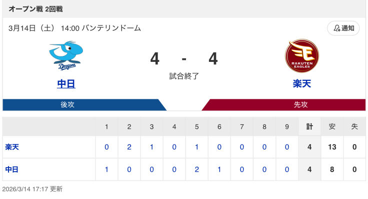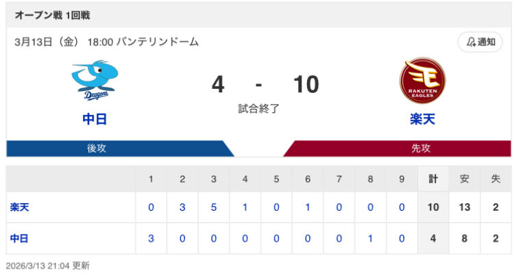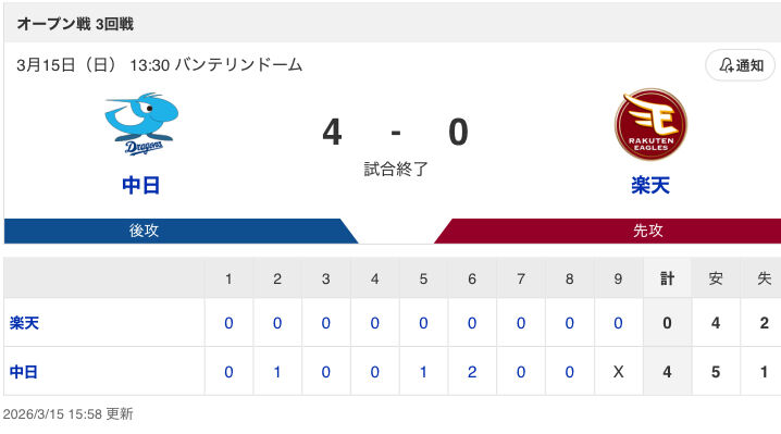 【試合結果】中日 4-0 楽天 投打噛み合い快勝!ベテラン涌井らが完封リレー&打ってはサノの3号2ランなどで4得点!!! 2026年03月15日 カテゴリ:中日ドラゴンズ mixiチェック https://baseball.yahoo.co.jp/npb/game/2021040083/top731: 風吹けば名無し 26/03/15(日) 15:58:18 ID:lV.un.L26カッタガネー 【【試合結果】中日 4-0 楽天 投打噛み合い快勝!ベテラン涌井らが完封リレー&打ってはサノの3号2ランなどで4得点!!!】の続きを読む タグ :#ドラゴンズ#試合結果#オープン戦#勝野昌慶