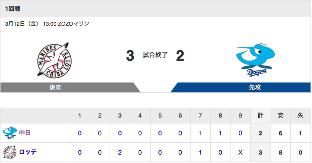 【試合結果】中日 2-3 ロッテ 高橋・京田がホームラン 小笠原5回2失点 2021年03月12日 カテゴリ:中日ドラゴンズ mixiチェック 293: 風吹けば名無し 21/03/12(金)15:55:06 ID:Fk.kj.L16マケタガネー 【【試合結果】中日 2-3 ロッテ 高橋・京田がホームラン 小笠原5回2失点】の続きを読む タグ :#ドラゴンズ#オープン戦#試合結果#滝野要#鈴木博志